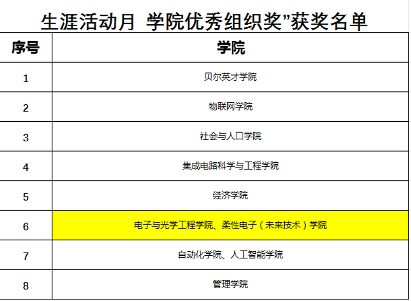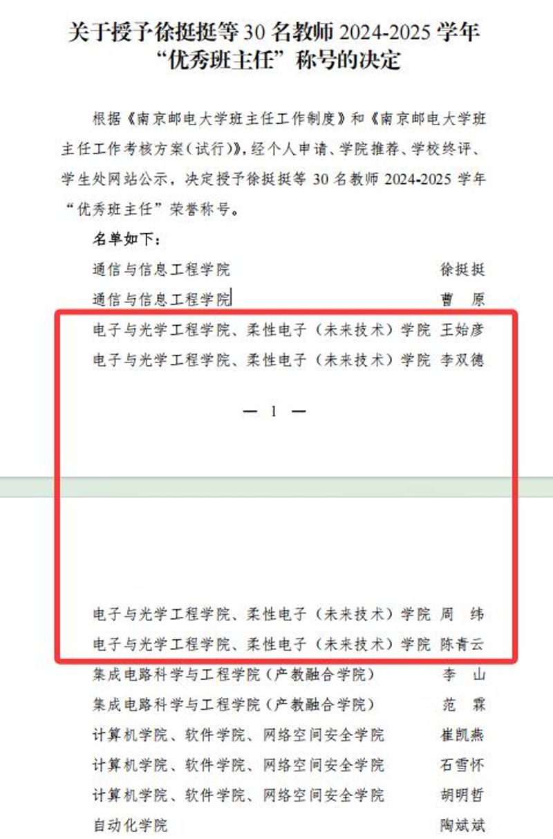 近日,南京郵電大學(xué)2024-2025學(xué)年“優(yōu)秀班主任”評選結(jié)果正式揭曉。全校共30位教師獲此殊榮,其中,電子與光學(xué)工程學(xué)院、柔性電子(未來技術(shù))學(xué)院共有四位教師光榮入選,分別是王始彥、李雙德、周緯、陳青云。本次評選注重學(xué)生的真實反饋,根據(jù)“學(xué)生評價情況”(即班主任工作測評分?jǐn)?shù))和班主任提交的各類履職材料,對各位班主任老師的履職情況進行綜合評定,最終擇優(yōu)入選。電光柔院此次能夠有四位教師脫穎而出,榮獲校級“優(yōu)秀班主任”稱號,是學(xué)校對學(xué)院班主任工作整體水平和育人實效的高度認(rèn)可。入選老師在日常工作中,始終堅守育人初心,恪盡職守,在思想引領(lǐng)、學(xué)業(yè)指導(dǎo)、生涯規(guī)劃、班級管理等方面傾注了大量心力,贏得了學(xué)生一致好評。此次優(yōu)異成績的取得是學(xué)院長期以來堅持立德樹人根本任務(wù)、不斷加強和改進班主任工作的成果體現(xiàn)。電光柔院將以此為契機,持續(xù)深化班主任隊伍建設(shè),充分發(fā)揮優(yōu)秀班主任的示范引領(lǐng)作用,不斷探索學(xué)生工作的新思路、新方法,努力提升人才培養(yǎng)質(zhì)量,為學(xué)生的全面成長成才和學(xué)校的高質(zhì)量發(fā)展做出更大貢獻。撰稿:祝騰審核:徐磊編輯:祝騰